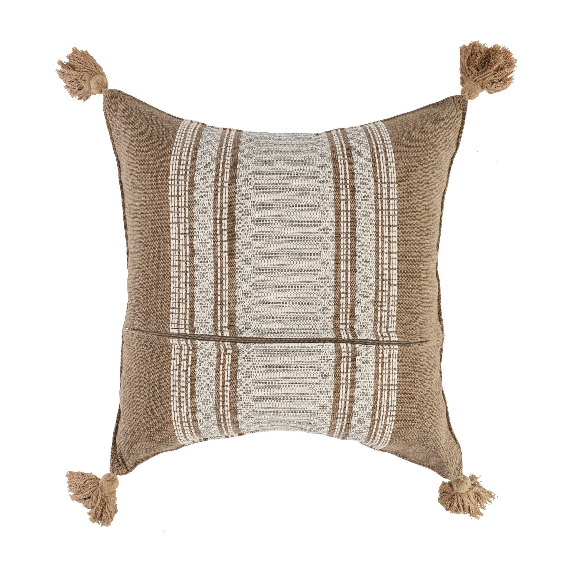 Its earthy brown base is beautifully complemented by subtle beige embroidery, adding texture and refined elegance without compromising the fabric’s natural look. Available in both square (19.68 x 19.68 in) and rectangular (19.68 x 13.77 in) formats, it features handcrafted thread pom-poms on each corner—a signature detail that adds movement and personality.